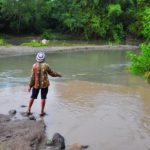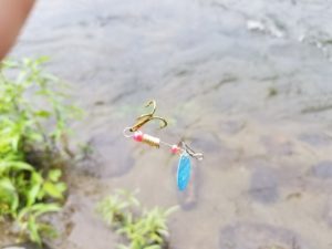 写真のように、糸を適度に伸ばして、足元の浅瀬でルアーの動きをみます。