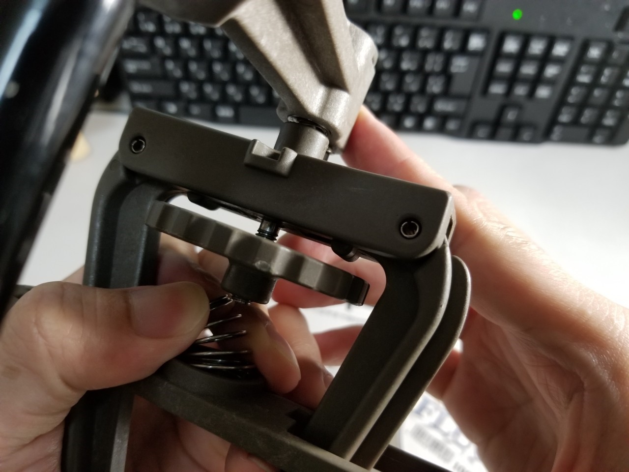 ↓替えの糸のボビンのようなものもスプールというそうです。そのスプールを挟み込みますが、写真のようにバネを手でずらすと楽に調節できました。