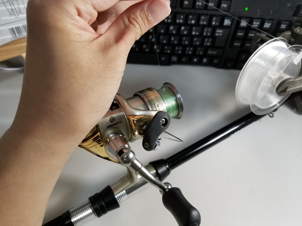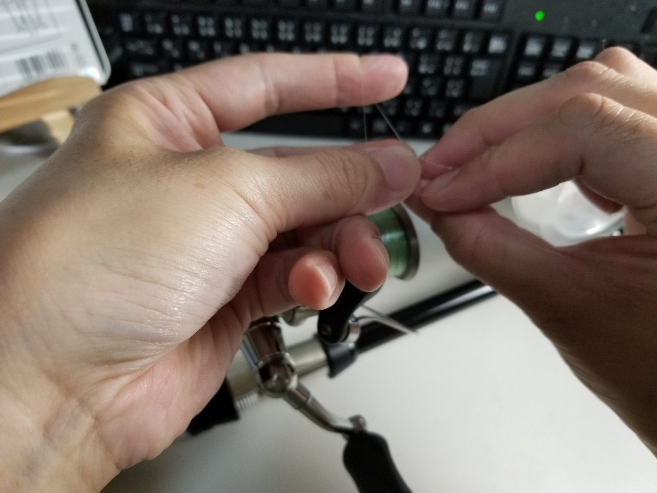 ↓リール側へは「クリンチノット」で十分です。ベイルアームを立てるのを忘れないようにしてください。